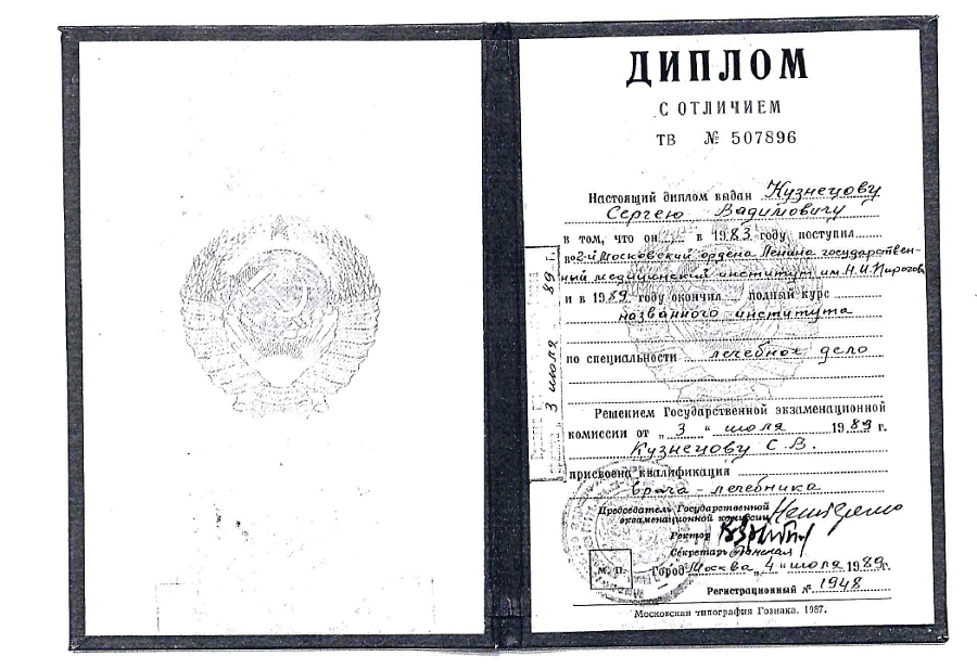 - Диплом по специальности "Лечебное дело (Лечебно-профилактическое дело)", 2-й Московского ордена Ленина государственный медицинский институт им. Н.И.Пирогова (1989 г.)