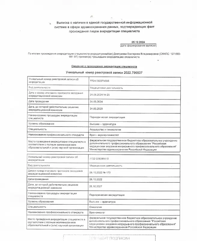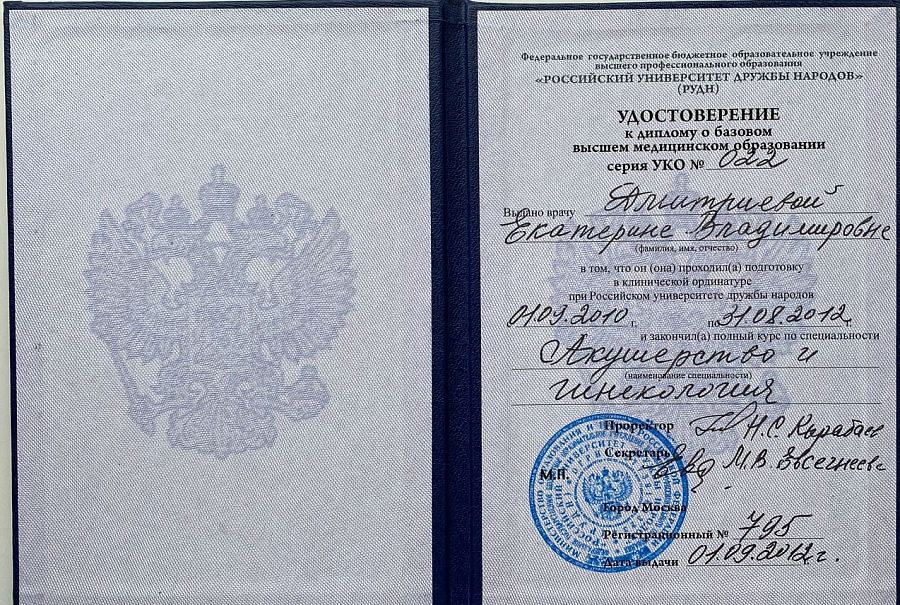 - Ординатура по специальности "Гинеколог", Российский университет дружбы народов (2012 г.)