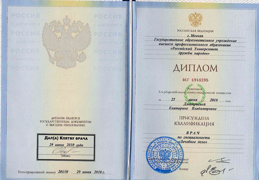 - Диплом по специальности "Лечебное дело", Российский университет дружбы народов (2010 г.)