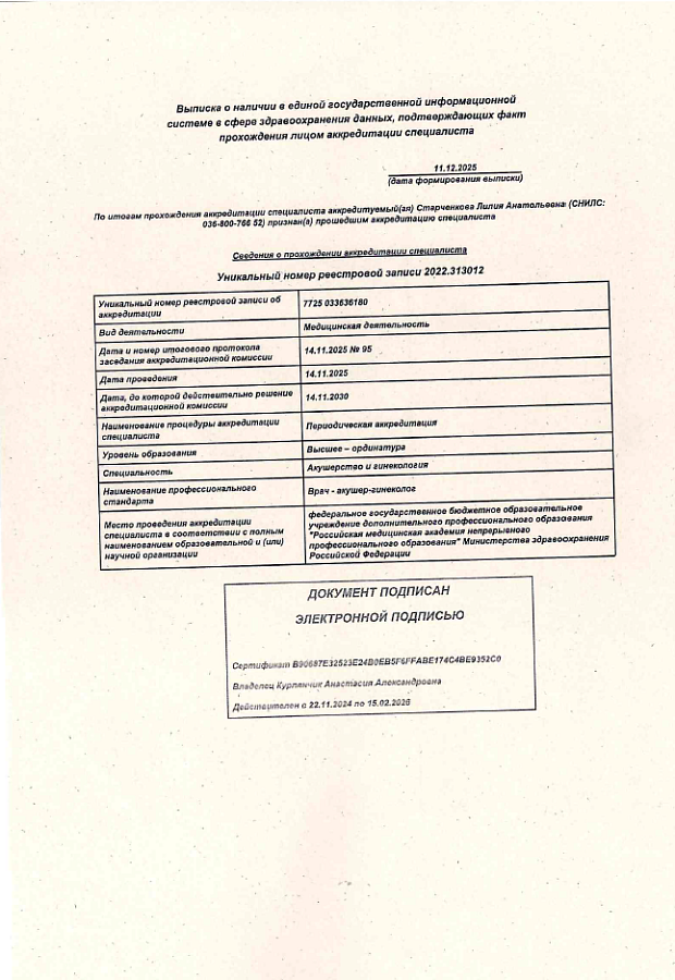 - "Акушерство и гинекология", Новосибирский государственный медицинский университет (2016 г.)