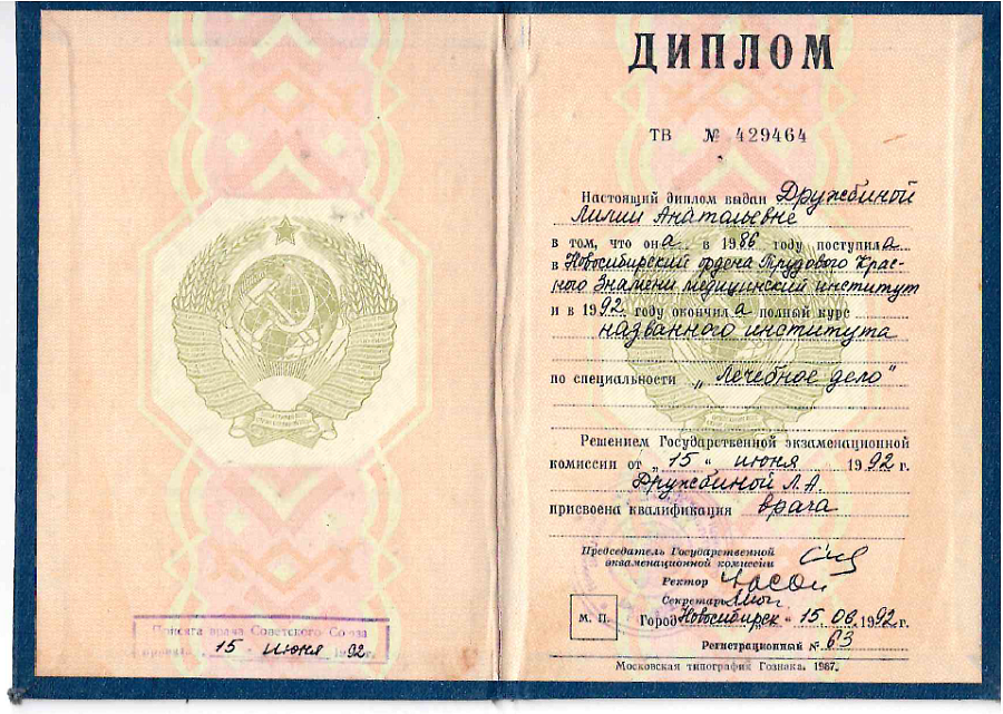 - Диплом по специальности "Лечебное дело", Новосибирский государственный медицинский университет (1986 г.)