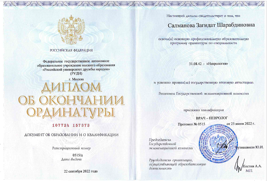 - Диплом по специальности "Лечебное дело", Первый Московский государственный медицинский университет им. И.М. Сеченова (2019 г.)