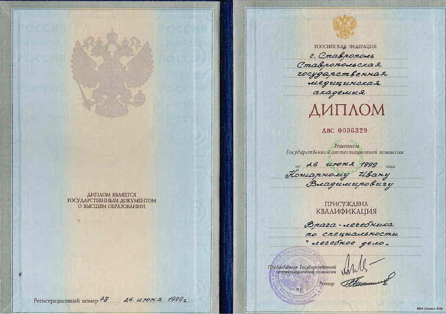 - Диплом по специальности "Лечебное дело (Лечебно-профилактическое дело)", Ставропольская государственная медицинская академия (1999 г.)