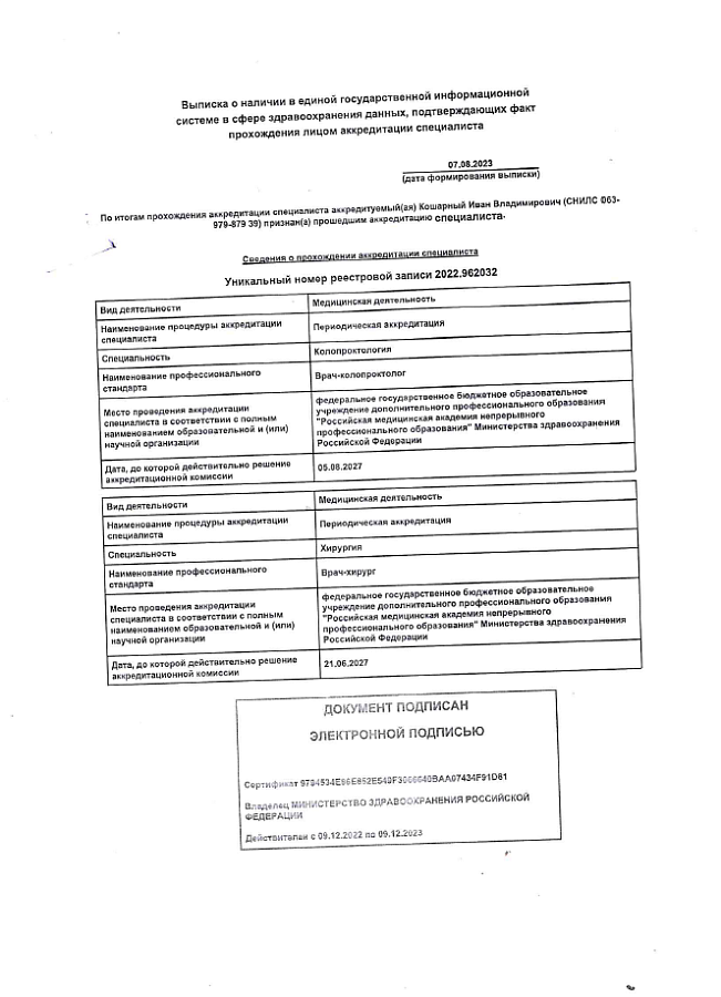 - "Эндовидеохирургия органов брюшной полости и забрюшинного пространства", Санкт-Петербургская медицинская академия последипломного образования (2005 г.)