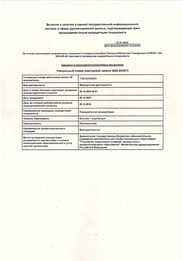 Услуги, оказанные рентгенологом Вячеславом Геннадьевичем, стало моим спасеньем. Пришел к нему с болью в ногах, провели исследование, позаботился и объяснил мне все результаты подробно и понятно. Не осталось сомнений в его работе - он был очень деликатен и терпеливый с моими вопросами и беспокойством. Благодарность Вам.
