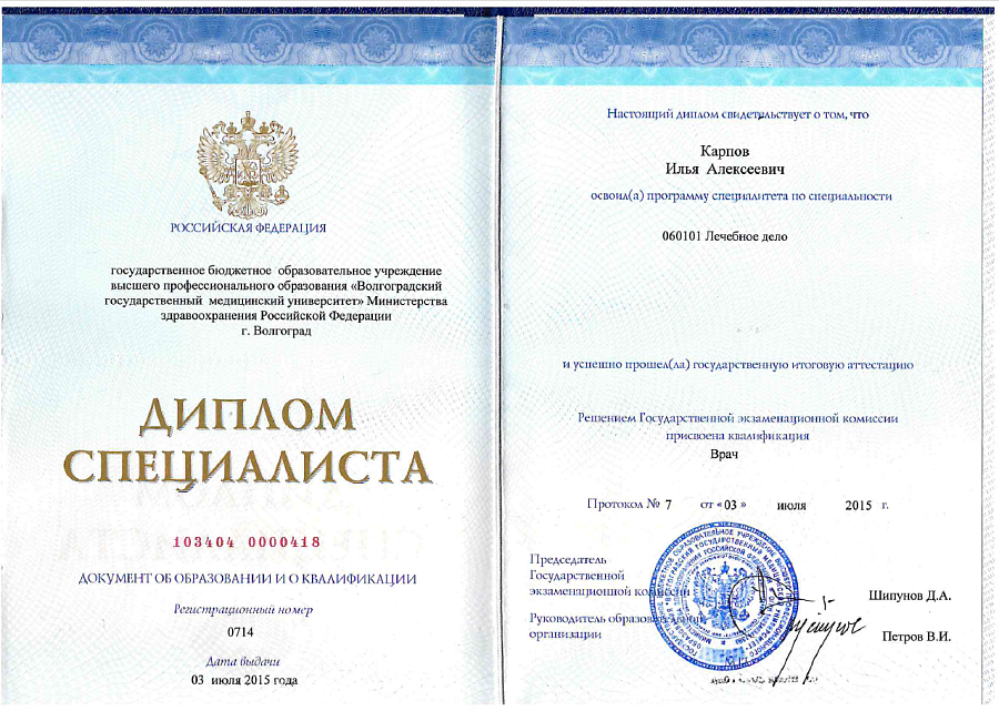 - Диплом по специальности "Лечебное дело", Волгоградский государственный медицинский университет (2015 г.)