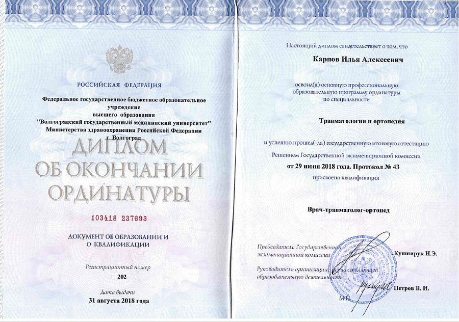 - Интернатура по специальности "Травматология и ортопедия", Волгоградский государственный медицинский университет (2016 г.)