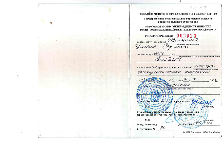Интернатура по специальности "Терапия", Волгоградский государственный медицинский университет (2006 г.)