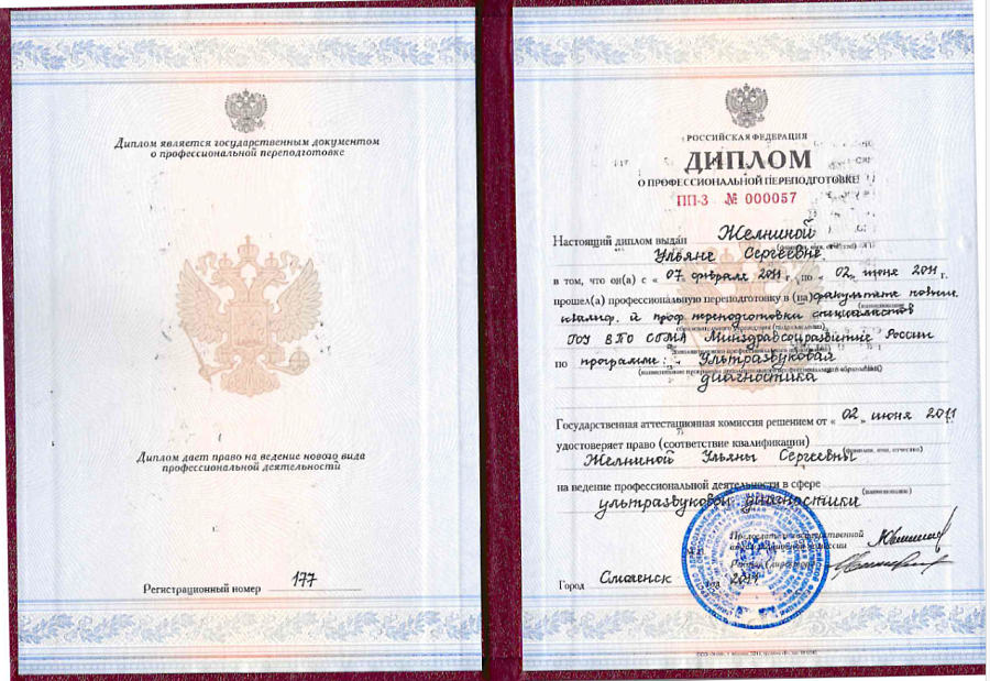 Диплом о профессиональной переподготовке по специальности "Ультразвуковая диагностика", Волгоградский государственный медицинский университет (2014 г.)